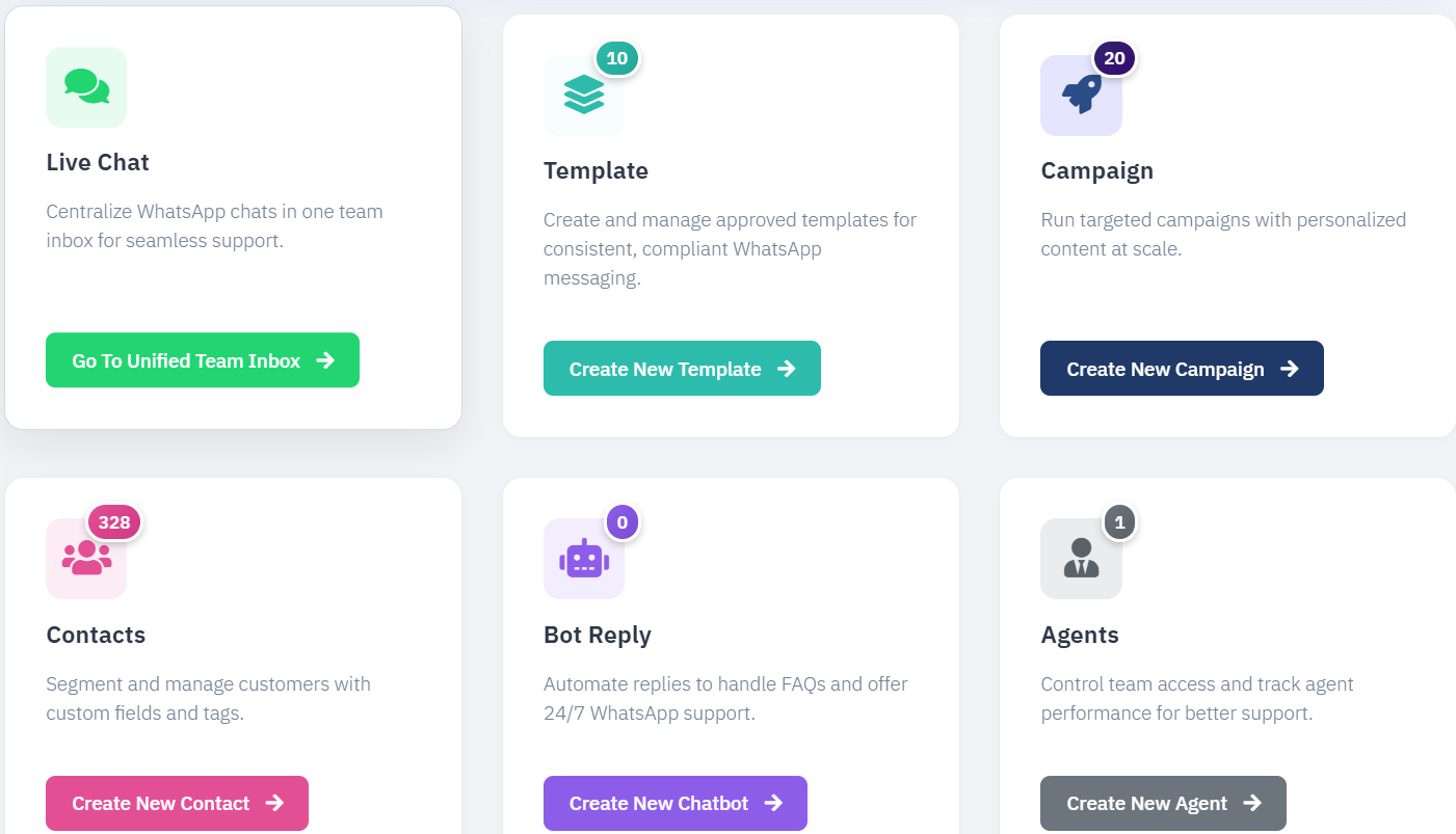A centralized dashboard that gives you complete control over your WhatsApp business operations: